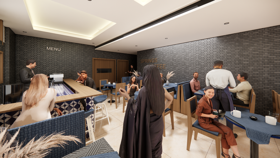 This 750-square-foot coffee shop is envisioned as a serene escape, designed in the timeless language of Delftware and Dutch design. The interiors draw inspiration from the iconic blue-and-white ceramic tradition, with crisp white walls serving as a canvas for delicate hand-painted motifs and patterned tiles. Minimal, well-crafted wooden furniture echoes the clean lines and warmth of Netherlands design, while natural light enhances the airy, uncluttered ambience. Subtle accents in cobalt blue, from upholstery to ceramic light fixtures, infuse character without overwhelming the space. The result is a compact yet inviting café that celebrates Dutch artistry, craftsmanship, and understated contemporary charm.